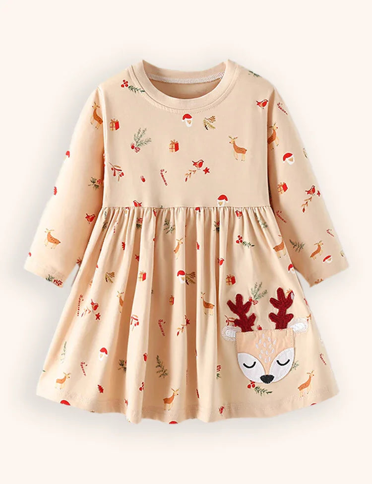 Christmas Little Deer Applique Long Sleeve Dress
