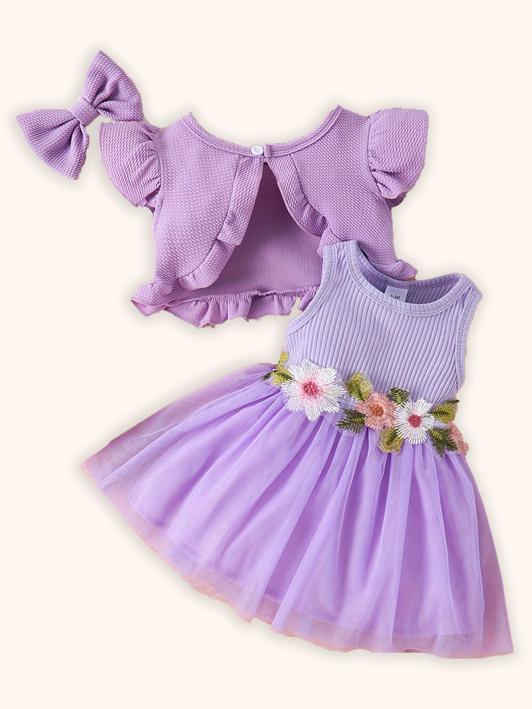Flower Embroidered Tulle Dress + Knitted Coat Set
